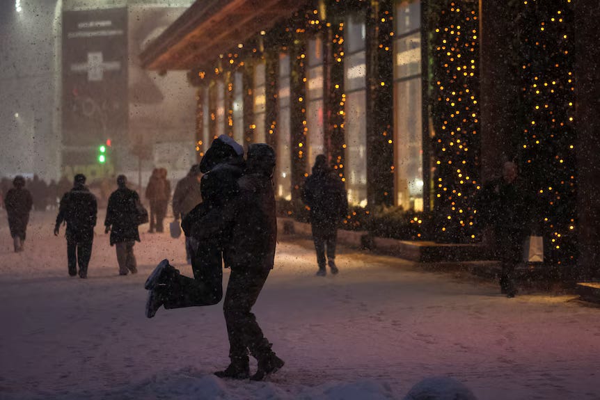 Photo credit: Gelb Garanich / Reuters. A couple embraces in Kyiv, Ukraine on New Year’s Eve, 2025.